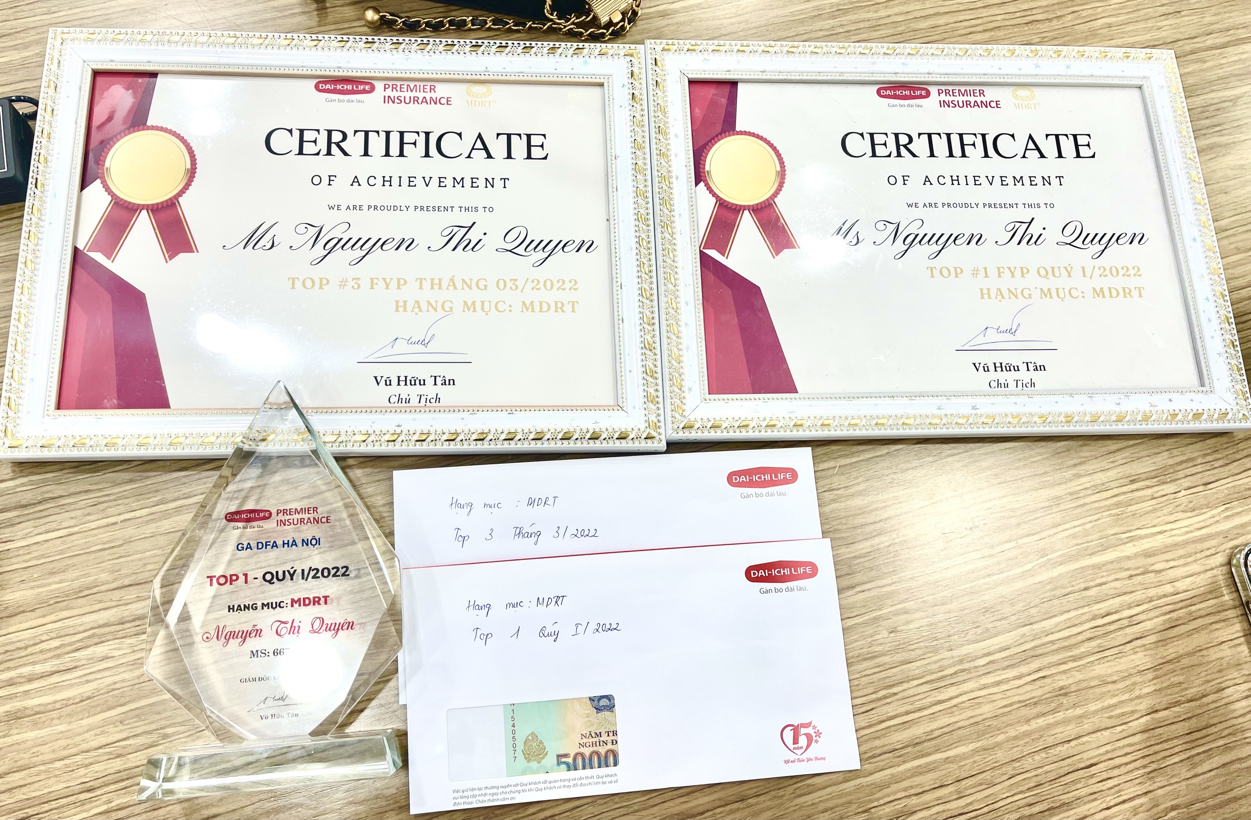 “Việc gì khó đã có team Quyên lo” chính là châm ngôn hoạt động làm việc của Quyên.  Ba năm làm việc tại DFA Premier Mai Quyên đều đạt on top, nhiều lần đạt các giải thưởng lớn, top 10 doanh thu. Hiện tại cô đang giữ danh hiệu cao quý của ngành là Royal MDRT.